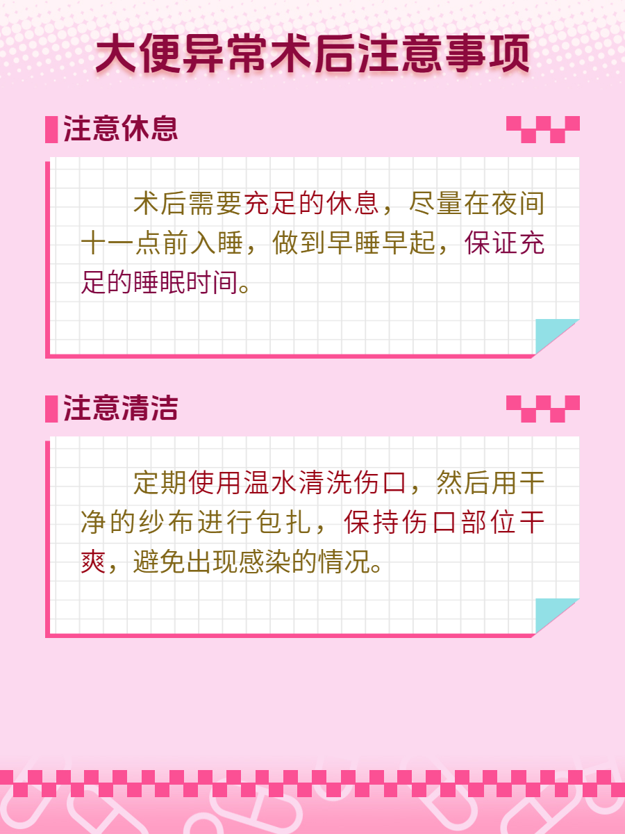 🌸1、多注意休息,避免过早的下地活动或进行剧烈运动,以免导致术后肠道出血或其他并发症。